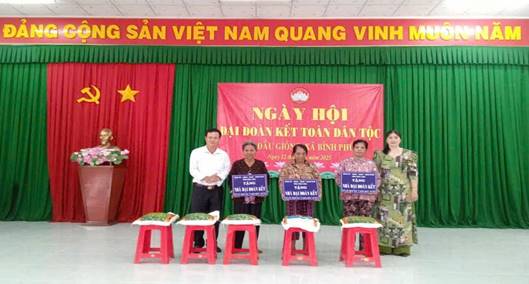 Cũng trong dịp Đại đoàn kết toàn dân tộc Ủy ban Mặt trận Tổ quốc Việt Nam xã Bình Phú trao 30 phần quà tiền mặt (mỗi phần trị giá 1.000.000 đồng) và 19 phần gạo, nguồn vận động từ các Quý Công ty, Doanh nghiệp, Mạnh thường quân hỗ trợ cho các hộ có hoàn cảnh khó khăn, thể hiện tinh thần “tương thân tương ái”, góp phần củng cố khối đại đoàn kết toàn dân tộc.