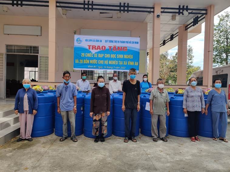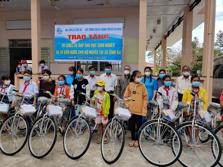 Nằm trong chuỗi thực hiện các phần việc thực hiện chỉ thị 01/CT-TU của Tỉnh ủy về “Đồng khởi mới” Sáng ngày 14/3/2022, tại xã Vĩnh An, huyện Ba Tri. Được sự hỗ trợ của bà Lý Thu Linh-đại diện Quỹ tương trợ Thành phố Hồ Chí Minh, ông Nguyễn Văn Phon - Cơ sở khám chữa bệnh Đông y xã Vĩnh An vận động, Ban Thường trực Ủy ban MTTQ Việt Nam huyện Ba Tri phối hợp Hội LHPN xã tổ chức trao tặng 20 chiếc xe đạp và 20 bồn nước cho học sinh, người dân nghèo tại địa phương.