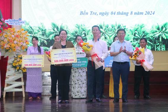 Tại buổi lễ, đại diện lãnh đạo tỉnh tiếp nhận đăng ký ủng hộ xây dựng nhà ở với tổng số tiền là 12,4 tỷ đồng và trao hoa cho 04 tổ chức, cá nhân thay lời cảm ơn. Đồng thời, Chủ tịch UBND tỉnh đã tặng bằng khen cho 13 tập thể và 05 cá nhân đã tích cực vận động, ủng hộ vật chất xây dựng nhà tình nghĩa cho gia đình chính sách trên địa bàn tỉnh Bến Tre. Đại diện 45 hộ trong tổng số 250 hộ gia đình trên địa bàn tỉnh được hỗ trợ nhà ở nhận quyết định bàn giao nhà tình nghĩa và quà của tỉnh.