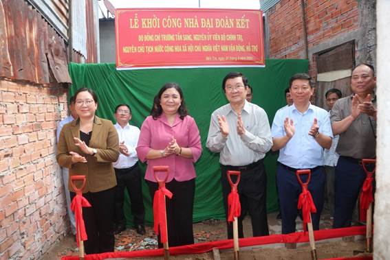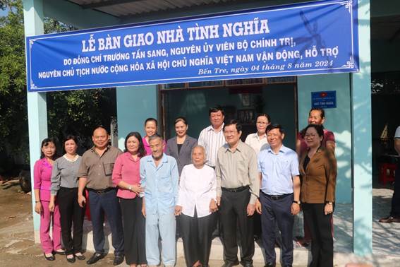Trước đó, buổi sáng cùng ngày, Tỉnh ủy, Hội đồng nhân dân, Ủy ban nhân dân, Ủy ban MTTQ Việt Nam tỉnh Bến Tre tổ chức trao nhà tình nghĩa cho hộ bà Nguyễn Thị Nhan, 81 tuổi, ngụ tại xã Phú Hưng, thành phố Bến Tre. Sau 03 tháng tổ chức triển khai thực hiện, với tinh thần trách nhiệm cao của các cơ quan, đơn vị và chính quyền địa phương, đến nay 250 căn nhà do nguyên Chủ tịch nước Trương Tấn Sang vận động cho hộ người có công, hộ nghèo khó khăn về nhà ở đã được khởi công xây dựng và cơ bản hoàn thành, đưa vào sử dụng. Kinh phí hỗ trợ xây dựng 70 triệu đồng/căn. Ngoài ra, tùy theo điều kiện kinh tế của từng hộ gia đình có thể góp thêm kinh phí, ngày công lao động và vật liệu hiện có để nhà ở được bền chắc hơn với kinh phí xây dựng bình quân 107 triệu đồng/căn.