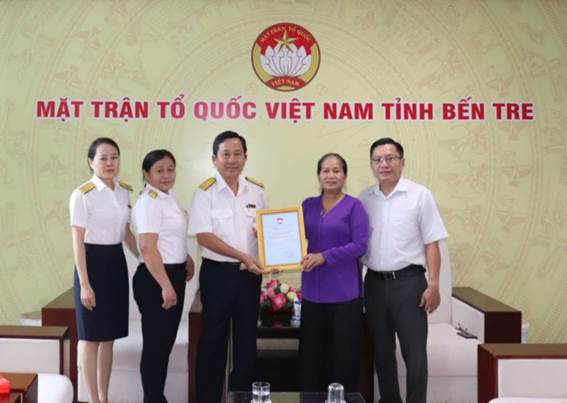 Theo đó, Ủy ban Mặt trận Tổ quốc Việt Nam tỉnh đã tiếp nhận số tiền ủng hộ là 2,59 tỷ đồng từ các đơn vị, doanh nghiệp như: Đảng bộ - dân - quân huyện Giồng Trôm 1,5 tỷ đồng; huyện Mỏ Cày Nam 900 triệu đồng; cán bộ, nhân viên Cục Thuế tỉnh Bến Tre 145 triệu đồng; Hiệp hội Du lịch tỉnh Bến Tre 32,6 triệu đồng; Hội doanh nghiệp thành phố Bến Tre 12,5 triệu đồng.