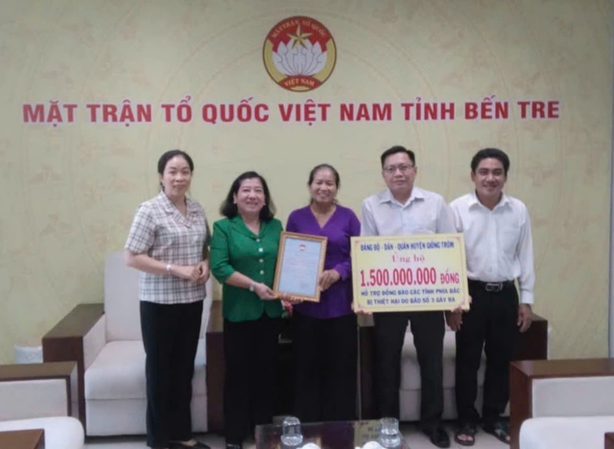 Tính đến ngày 06/10/2024, Ủy ban Mặt trận Tổ quốc Việt Nam tỉnh Bến Tre đã tiếp nhận kinh phí ủng hộ đồng bào các tỉnh phía Bắc bị thiệt hại do ảnh hưởng của Bão số 3 của 1.374 lượt tổ chức, cá nhân, với tổng số tiền là 15,297 tỷ đồng. Danh sách các đơn vị, cá nhân ủng hộ được công bố từng đợt trên trang Fanpage, Webiste của Mặt trận Tổ quốc Việt Nam tỉnh Bến Tre và đến nay đã công bố danh sách đợt thứ 4./.