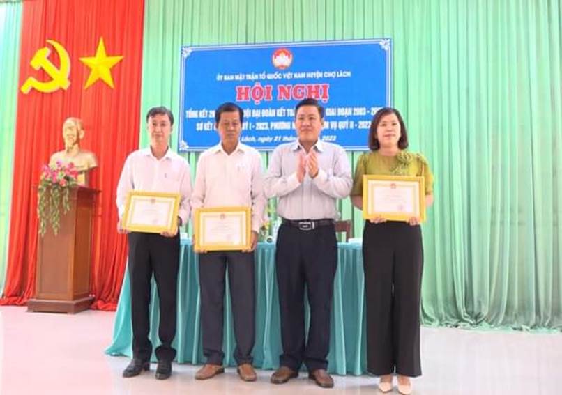Ngày 21/4/2023, Uỷ ban Mặt trận Tổ quốc Việt Nam huyện Chợ Lách tổ chức Hội nghị tổng kết 20 năm Ngày hội Đại đoàn kết toàn dân tộc, giai đoạn 2003 – 2023; sơ kết công tác Mặt trận quý I năm 2023 và triển khai phương hướng, nhiệm vụ quý II năm 2023. Dự và chỉ đạo Hội nghị có bà Nguyễn Thị Mai Rý, Phó Chủ tịch Thường trực Ủy ban MTTQ Việt Nam tỉnh, ông Nguyễn Văn Đảm, Bí thư Huyện uỷ; ông Phạm Anh Linh, Chủ tịch UBND huyện; ông Lê Văn Thế, Phó Chủ tịch HĐND huyện và các vị Uỷ viên Uỷ ban Mặt trận Tổ quốc Việt Nam huyện.