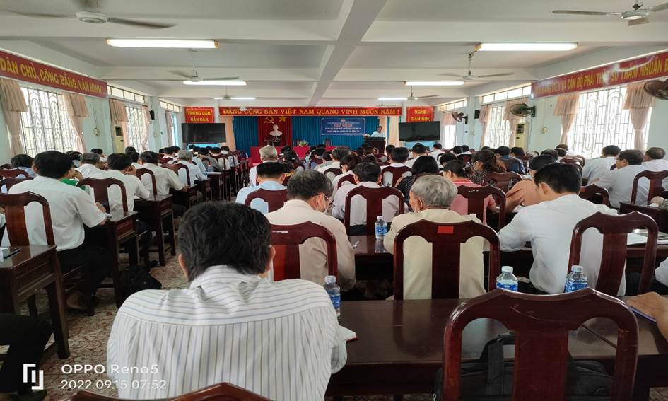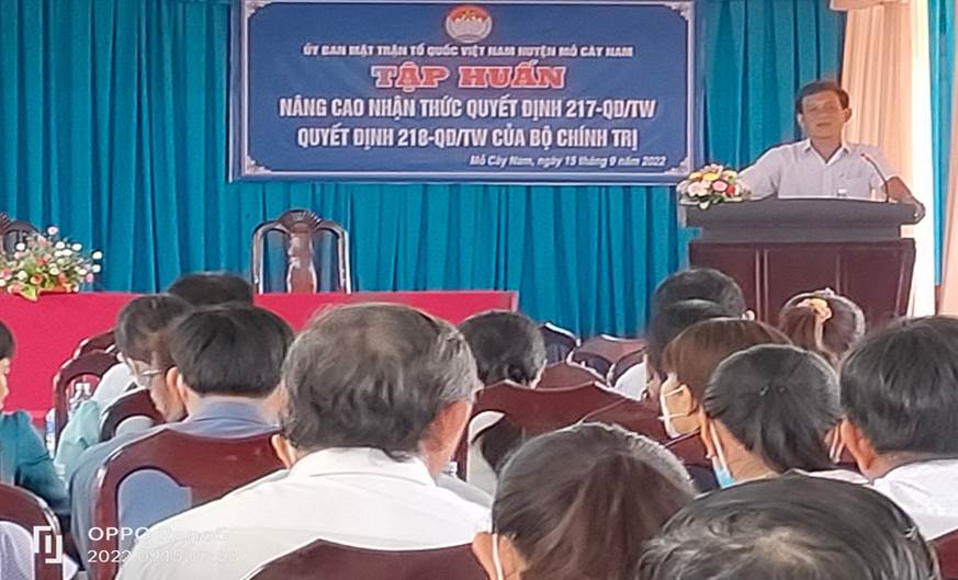 Ngày 15/9/2022, Ban Thường trực Ủy ban MTTQ Việt Nam huyện Mỏ Cày Nam tổ chức tập huấn nâng cao nhận thức Quyết định số 217-QĐ/TW và Quyết định số 218-QĐ/TW của Bộ Chính trị trên địa bàn huyện Mỏ Cày Nam. Tham dự buổi tập huấn có 121 đại biểu gồm lãnh đạo Văn phòng Huyện ủy; HĐND-UBND; Bí thư Đảng ủy Bệnh viện Đa khoa khu vực Cù Lao Minh; Phòng KT&HT; Ban Quản lý dự án; Phòng Tài chính-Kế hoạch; Phòng Tài nguyên và Môi trường; lãnh đạo các tổ chức chính trị-xã hội; cấp xã có: Thường trực Đảng ủy; UBND; lãnh đạo các tổ chức chính trị-xã hội.