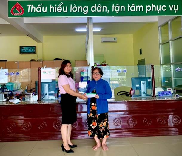 Cô Hoa nhận tiền hỗ trợ từ chương trình “Mẹ đỡ đầu” của công đoàn NHCSXH tại PGD NHCSXH huyện Mỏ Cày Bắc