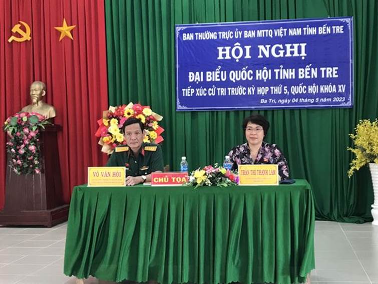 Sáng ngày 04/5/2023, Đoàn đại biểu Quốc hội (ĐBQH) đơn vị tỉnh Bến Tre gồm: Bà Trần Thị Thanh Lam - Ủy viên Thường trực Ủy ban Xã hội của Quốc hội, ông Võ Văn Hội - Ủy viên Ban Thường vụ Tỉnh ủy, Chỉ huy trưởng Bộ Chỉ huy Quân sự tỉnh có buổi tiếp xúc với bà con cử tri các xã Tân Xuân, Tân Mỹ, Phú Lễ và Phước Ngãi của huyện Ba Tri. Tham dự buổi tiếp xúc có lãnh đạo Huyện ủy, UBND huyện; cùng đại biểu lãnh đạo các sở, ban, ngành, MTTQ, các đoàn thể tỉnh, huyện và các xã.