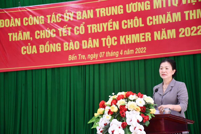Thay mặt đoàn công tác, Phó Chủ tịch Ủy ban Trung ương Mặt trận Tổ quốc Việt Nam Trương Thị Ngọc Ánh gửi lời chúc mừng đến đồng bào dân tộc Khmer sinh sống tại tỉnh Bến Tre nhân dịp gặp mặt trước thềm Tết cổ truyền Chôl Chnăm Thmây năm 2022. Bà đánh giá cao những thành quả mà đồng bào dân tộc Khmer trên địa bàn tỉnh Bến Tre thời gian qua đã luôn đoàn kết, đặc biệt trong thời gian dịch Covid – 19 diễn ra phức tạp, đồng bào dân tộc đã đóng góp công sức cùng với chính quyền địa phương vượt qua khó khăn, phát triển kinh tế và ổn định cuộc sống. Bên cạnh đó, đồng bào dân tộc đã tích cực hưởng ứng thực hiện tốt chủ trương, nghị quyết của Đảng, chính sách, pháp luật của Nhà nước, tham gia các cuộc vận động, các phong trào thi đua yêu nước do Mặt trận Tổ quốc Việt Nam phát động. Trong thời gian tới, bà tin tưởng rằng đồng bào dân tộc Khmer huyện Giồng Trôm tiếp tục phát huy truyền thống đoàn kết, truyền thống Đồng Khởi của Bến Tre, quê hương của các anh hùng, nổ lực, phấn đấu vươn lên ổn định cuộc sống, tích cực thi đua lao động, học tập để xây dựng cuộc sống ngày càng tốt đẹp hơn. Nhân dịp gặp mặt này, bà chúc các đồng bào dân tộc Khmer năm mới vui vẻ, an toàn, cuộc sống ngày càng ấm no và hạnh phúc.