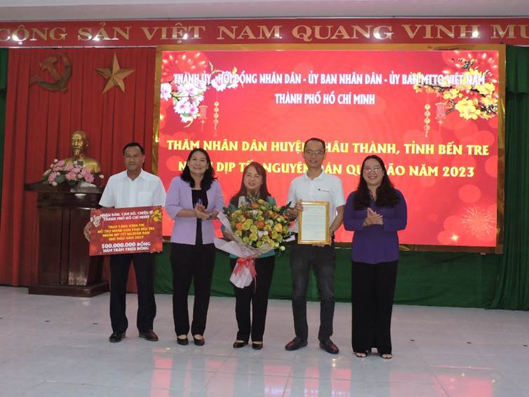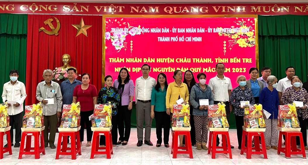 Nhân dịp Tết Nguyên đán Quý Mão năm 2023, sáng ngày 15/01/2023, đoàn lãnh đạo Thành phố Hồ Chí Minh do bà Trần Kim Yến, Ủy viên Ban Thường vụ Thành ủy, Chủ tịch Ủy ban MTTQ Việt Nam Thành phố Hồ Chí Minh làm Trưởng đoàn đến thăm, tặng quà Tết cho các gia đình chính sách, người dân có hoàn cảnh khó khăn tại huyện Châu Thành, tỉnh Bến Tre. Cùng tham gia với Đoàn có bà Lê Thị Kim Hồng, Bí thư Quận ủy Quận Tân Phú, Thành phố Hồ Chí Minh; lãnh đạo đơn vị đồng hành cùng Quỹ “Vì người nghèo” Thành phố Hồ Chí Minh.