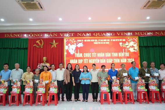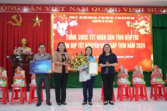 Dịp này, lãnh đạo TP. Hồ Chí Minh trao bảng tượng trưng hỗ trợ kinh phí 500 triệu đồng chăm lo Tết năm 2024 cho tỉnh Bến Tre; đồng thời, lãnh đạo tỉnh Bến Tre trao Thư cảm ơn và hoa đến đơn vị tài trợ thay lời cảm ơn đến quý lãnh đạo TP. Hồ Chí Minh, qua đó ghi nhận những tình cảm, sự hỗ trợ đầy nghĩa tình của cán bộ, nhân dân, chiến sĩ TP. Hồ Chí Minh đối với tỉnh Bến Tre.