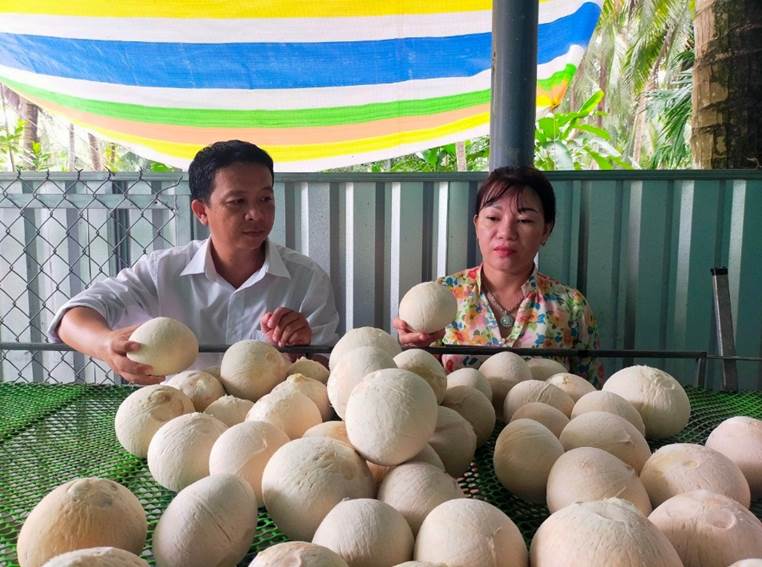 Chị Xa cho biết: “Tiêu chuẩn khi đến vườn Dừa mua về gọt trọc đó là, mùa mưa độ ngọt từ 5 chấm trở lên, mùa nắng độ ngọt từ 7 chấm trở lên, lựa chọn trái dừa không quá non, cũng không quá dày, nếu trái dừa già quá nước nó có độ ga, có những khách hàng không vừa ý. Dừa đem về gọt và thành phẩm đưa đến tay người tiêu dùng trong ngày để đảm bảo trái dừa giữ được độ ngọt và độ tươi tự nhiên. Sau khi dừa được vận chuyển về cơ sở sản xuất, để có được trái dừa xiêm gọt trọc đẹp mắt, đáp ứng yều cầu thị trường phải trải qua nhiều công đoạn như: lột sạch vỏ, dùng máy bào gọt phần sơ cứng, ngâm vào nước chanh tự nhiên để làm trắng dừa, vớt ra để cho ráo nước rồi đưa vào máy sấy khô, sau đó tiến hành phân loại kích cỡ, bao giấy nhãn hiệu và đóng thùng thành phẩm”.