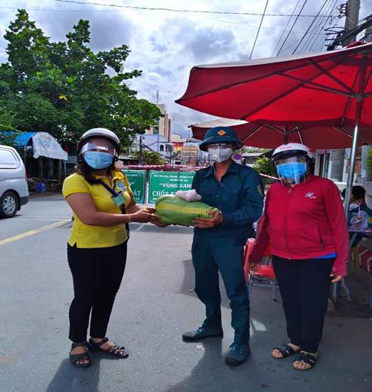 Chị Nguyễn Thị Tám (bên trái) vận động quà tặng lực lượng trực chốt kiểm soát dịch bệnh Covid 19 trên địa bàn phường