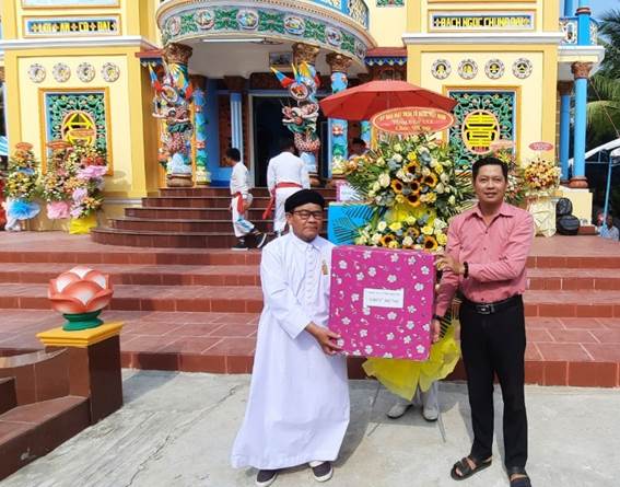 Ông Nguyễn Hồng Quân, Trưởng Ban Tôn giáo (Sở Nội vụ) tặng hoa và quà chúc mừng