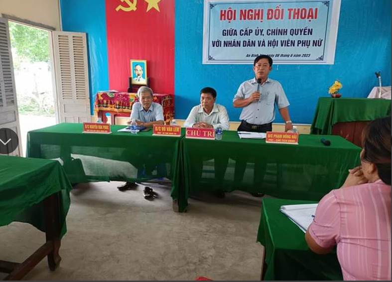 Thực hiện Quyết định 2242- QĐ/TU ngày 03/02/2015 của Ban Thường vụ Tỉnh ủy về việc ban hành Quy định của người đứng đầu cấp ủy, chính quyền các cấp trực tiếp đối thoại với nhân dân theo Quyết định 218- QĐ/TW của Bộ chính trị. Được sự thống nhất của Đảng ủy xã, ngày 08/6/2023 tại trụ sở ấp An Phú, Ban chỉ đạo thực hiện QCDC và Hội LHPN xã An Bình Tây phối hợp tổ chức Hội nghị đối thoại trực tiếp giữa lãnh đạo Đảng ủy, chính quyền địa phương với hội viên, phụ nữ và nhân dân xã.