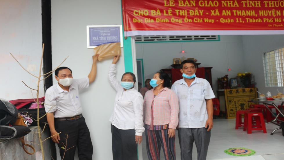 Phát biểu tại lễ bàn giao nhà, bà Trịnh Thị Thanh Bình-PCT Hội NNCĐDC/dioxin- BVQTE tỉnh Bến Tre cảm ơn gia đình ông Ôn Chí Huy nhiều năm qua luôn đồng hành cùng với Hội quan tâm đến những gia đình nghèo có con cháu bị nhiễm chất độc da cam, có người thân bị mất trong dịch Covid-19 tại Bến Tre, bà cũng động viên gia đình cố gắng qua nỗi đau có người thân bị mất trong dịch bệnh Covid-19 vừa qua.