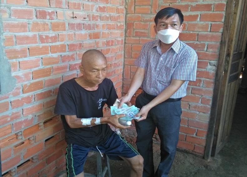 Ông Nguyễn Quốc Phong, UVTT Hội NNCĐDC/dioxin-BVQTE tỉnh Bến Tre trao tiền vận động tiền chữa bệnh cho ông Nguyễn Văn Hải