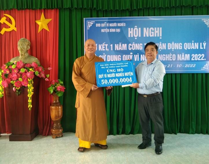 Tại hội nghị, các đại biểu đã đóng góp ý kiến vào các dự thảo báo cáo kết quả thực hiện và dự thảo Kế hoạch tổ chức vận động quỹ Vì người nghèo năm 2023 do Ủy ban Mặt trận Tổ quốc Việt Nam phát động. Cũng nhân dịp này Đại đức thích Phước Chí, Ủy viên Trung ương Giáo hội Phật giáo Việt Nam, Phó ban Trị sự Giáo hội Phật giáo Việt Nam, Trụ trì chùa Vạn Phước đã ủng hộ 50.000.000đ cho Quỹ “Vì người nghèo” của huyện. Đồng chí Trần Văn Phục, Ủy viên BTV Huyện ủy, Trưởng ban Dân vận, Chủ tịch Ủy ban MTTQ Việt Nam huyện đã trao thư cảm ơn cho Đại đức thích Phước Chí./.