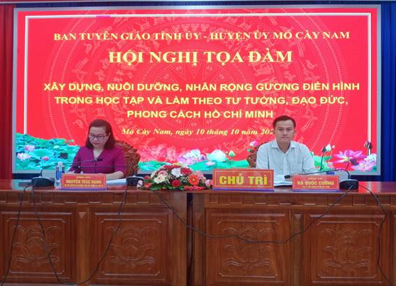 Sáng ngày 10/10/2023, tại Hội trường Ủy ban nhân dân huyện Mỏ Cày Nam, Phó Trưởng ban Thường trực Ban Tuyên giáo Tỉnh ủy Nguyễn Trúc Hạnh và Bí thư Huyện ủy Hà Quốc Cường đồng chủ trì hội nghị tọa đàm “Xây dựng, nuôi dưỡng, nhân rộng gương điển hình trong học tập và làm theo tư tưởng, đạo đức, phong cách Hồ Chí Minh”.
