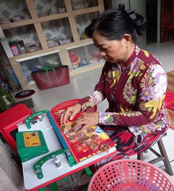 Chị Đẹp đang đóng gói sản phẩm kẹo Chuối
