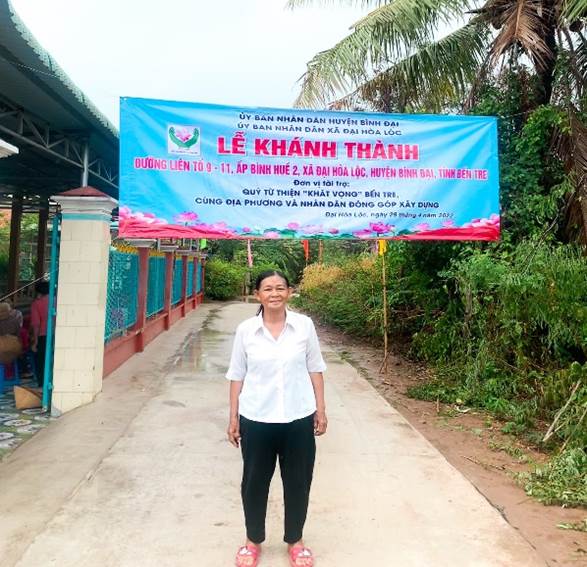 Ngay từ khi được Ủy ban nhân dân vận động, hàng chục hộ dân đã tình nguyện hiến đất, tài sản để hoàn thành tuyến đường tổ nhân dân tự quản số 9-11 với chiều dài 330m, tổng kinh phí xây dựng là 171 triệu đồng, trong đó chị vận động Nhân dân đóng góp là 40 triệu đồng. Để mở rộng diện tích thi công tuyến đường tổ Nhân dân tự quản số 17 đoạn đi ngang phần đất của gia đình chị, không ngần ngại chị đã hiến 180m đất trị giá trên 100 triệu đồng để bê tông hóa tuyến đường nêu trên, ngoài ra chị còn đóng góp 10 triệu đồng để bê tông tuyến đường tổ Nhân dân tự quản số 14.