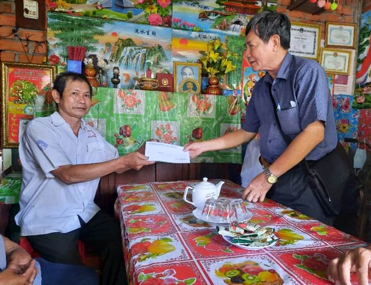 Ông Nguyễn Châu Sơn-Trưởng BĐD Hội NCT tỉnh tặng quà ông Võ Văn Cọc, ấp Thạnh Quý, thị trấn Thạnh Phú, huyện Thạnh Phú nhân dịp 27/7