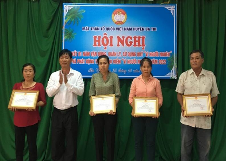Ba Tri là huyện thuần nông, ven biển, nằm trong vùng thường xuyên bị ảnh hưởng của biến đổi khí hậu, có tỷ lệ hộ nghèo cao, qua bình xét cuối năm 2021, huyện có 5.037 hộ nghèo, chiếm trên 9,3% và nhiều hộ có hoàn cảnh khó khăn, cần sự chung tay, góp sức giúp đỡ của cộng động. Chính từ những khó khăn trên, công tác giảm nghèo, chương trình an sinh xã hội là một trong những nhiệm vụ trọng tâm của địa phương. Mặt trận các cấp trong huyện đã phối hợp các ngành, các cấp, các tổ chức thành viên tích cực vận động các thành phần xã hội trong huyện, đặc biệt là quy tụ được các nguồn lực ngoài tỉnh, đã tranh thủ được sự ủng hộ của các mạnh thường quân, nhà tài trợ chăm lo cho công tác giảm nghèo, giúp đỡ những hoàn cảnh khó khăn trong huyện, góp phần thực hiện tốt công tác an sinh xã hội của huyện nhà.