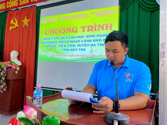 Uỷ ban nhân dân thị trấn Tiệm Tôm phối hợp với Uỷ ban Mặt trận Tổ quốc huyện Ba Tri, đoàn từ thiện phường 10, Q.11, Thành phố Hồ Chí Minh tổ chức chương trình trao tặng quà cho học sinh nghèo, hộ nghèo, hộ có hoàn cảnh khó khăn trên địa bàn thị trấn Tiệm Tôm.