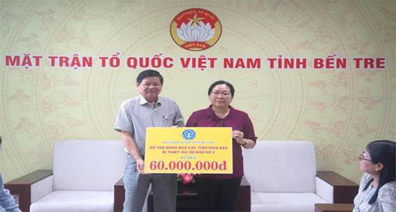 Chiều ngày 26/9/2024, bà Nguyễn Thị Hồng Nhung, Ủy viên Ban Thường vụ Tỉnh ủy, Chủ tịch Ủy ban MTTQ Việt Nam tỉnh tiếp nhận kinh phí hỗ trợ Nhân dân các tỉnh phía Bắc khắc phục hậu quả sau cơn bão số 3, do các đơn vị huyện Mỏ Cày Bắc, Bảo hiểm Xã hội tỉnh Bến Tre, Công ty Cổ phần Cấp thoát nước Bến Tre và Bệnh viện mắt Sông Tiền Bến Tre đến hỗ trợ. Đại diện lãnh đạo các đơn vị tài trợ có: bà Trần Thị Sol, Phó Bí thư Thường trực Huyện ủy Mỏ Cày Bắc; ông Nguyễn Văn Tho, Phó Bí thư Đảng ủy, Phó Giám đốc Bảo hiểm Xã hội tỉnh; ông Trần Hùng, Chủ tịch HĐQT công ty Cổ phần Cấp thoát nước Bến Tre; ông Trần Quốc Ngọc, Giám đốc Vận hành Bệnh viện Mắt Sông Tiền Bến Tre. Tổng kinh phí tiếp nhận từ các đơn vị là 420 triệu đồng. Tính đến thời điểm hiện tại, cơ quan Ủy ban MTTQ Việt Nam tỉnh đã tiếp nhận ủng hộ từ các cơ quan, tổ chức, doanh nghiệp, các nhà hảo tâm và cá nhân trong và ngoài tỉnh với tổng kinh phí gần tám tỷ đồng.