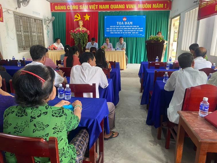 Nhằm tạo điều kiện để cán bộ MTTQ Việt Nam, các tổ chức thành viên, các ngành và người dân cùng chia sẻ thông tin, trao đổi kinh nghiệm, cùng bàn bạc, thảo luận tìm ra những giải pháp để tổ chức vận động Nhân dân tham gia xây dựng các tiêu chí nông thôn mới, tập trung các tiêu chí số 2,13,17,19; góp phần thực hiện đạt các tiêu chí xây dựng xã nông thôn mới. Cuối tháng 11/2022, Ban Thường trực Ủy ban MTTQ Việt Nam tỉnh Bến Tre tổ chức tọa đàm bàn giải pháp vận động Nhân dân tham gia thực hiện các tiêu chí xây dựng nông thôn mới gắn thực hiện Cuộc vận động “Toàn dân đoàn kết xây dựng nông thôn mới, đô thị văn minh” năm 2022 tại 05 xã (Tân Lợi Thạnh-Giồng Trôm; Phước Ngãi-Ba Tri; Tiên Thủy-Châu Thành; Thừa Đức-Bình Đại; An Thuận-Thạnh Phú).