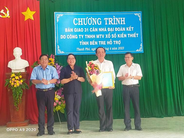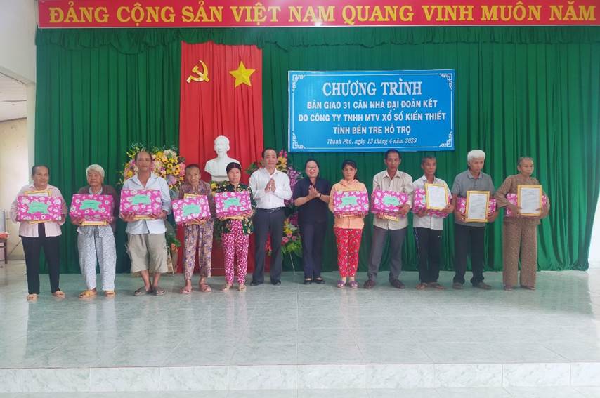 Theo báo cáo, nguồn kinh phí xây dựng 31 căn nhà Đại đoàn kết tại 03 xã: Hòa Lợi (11 căn), Bình Thạnh (14 căn) và An Thuận (06 căn) do Công ty TNHH MTV Xổ số kiến thiết tỉnh Bến Tre hỗ trợ với tổng kinh phí là 1,55 tỷ đồng (mỗi căn nhà trị giá 50 triệu đồng). Đến nay, 31 căn nhà Đại đoàn kết đã xây dựng hoàn thành đảm bảo chất lượng theo yêu cầu, diện tích tối thiểu 01 căn nhà là 34m2, tối đa 60m2 với số tiền xây dựng từ 60 triệu đồng – 100 triệu đồng (Công ty TNHH MTV Xổ số kiến thiết tỉnh Bến Tre hỗ trợ 50 triệu đồng, phần còn lại do gia đình đóng góp tiền và ngày công lao động). Các căn nhà đảm bảo 04 cứng gồm: Nền cứng, khung cứng, vách cứng, mái cứng và thời gian sử dụng đảm bảo trên 10 năm.