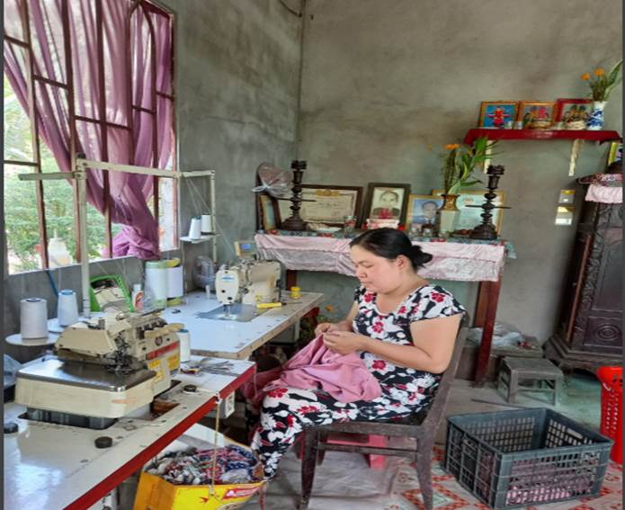 Chị xin vào công ty may Ming Đa làm được 03 năm, nhưng do hoàn cảnh gia đình khó khăn mẹ già và 02 con nhỏ đi học, chồng chị thì đi làm thuê ở xa nên không đỡ đần được việc trong nhà, từ đó chị xin nghỉ việc tại công ty. Với nguồn vốn dành dụm được chị mạnh dạn mở Tổ hợp may gia đình tại nhà để tiện việc chăm sóc mẹ và chăm lo các con, với số vốn ban đầu chưa đủ để đầu tư máy móc, chị vay thêm 50 triệu đồng từ Ngân hàng chính sách xã hội huyện để mua trang thiết bị để phục vụ sản xuất. Thời gian đầu mới thành lập, bản thân chị gặp rất nhiều khó khăn như tổ chỉ có 3 thành viên là những thợ may ở trong ấp, nhận hàng gia công cắt sẵn hết, về chỉ việc ráp lại, những ngày đầu không quen, mỗi người ráp không xong 01 bộ đồ, trong khi tiền công chỉ 10 ngàn đồng/bộ. Thế nhưng, khi các chị đã quen việc may gia công thì nguồn hàng lại không ổn định, sản phẩm không phong phú, thu nhập bấp bênh.