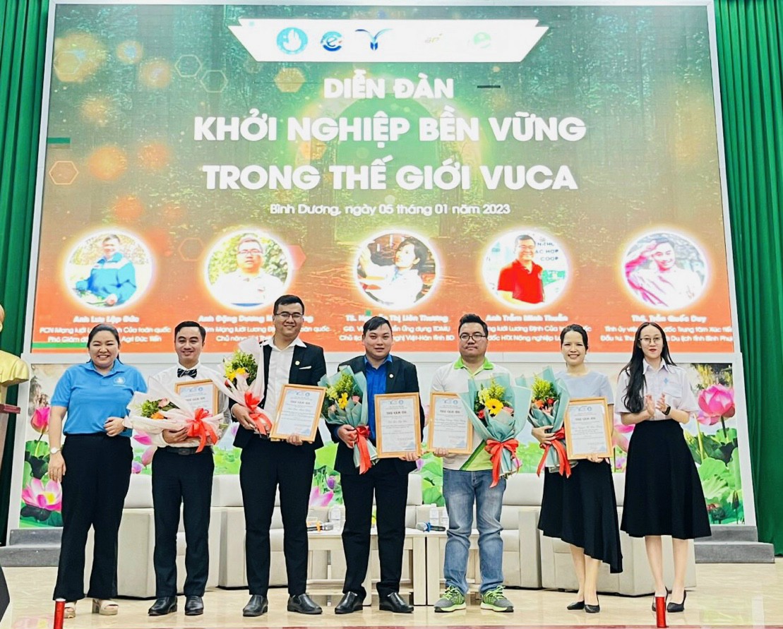 Anh Trầm Minh Thuần (thứ ba từ trái sang) làm takshow trao đổi giao lưu với sinh viên trường Đại học Thủ Dầu Một