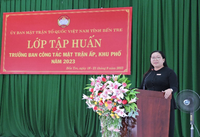 Chiều 21/9/2023, Ban Thường trực Ủy ban MTTQ Việt Nam tỉnh tổ chức bế giảng lớp tập huấn Trưởng Ban công tác Mặt trận ấp, khu phố (lớp thứ nhất) năm 2023, lớp có 139 học viên dự học. Chủ tịch Ủy ban MTTQ Việt Nam tỉnh Nguyễn Thị Hồng Nhung đến dự.