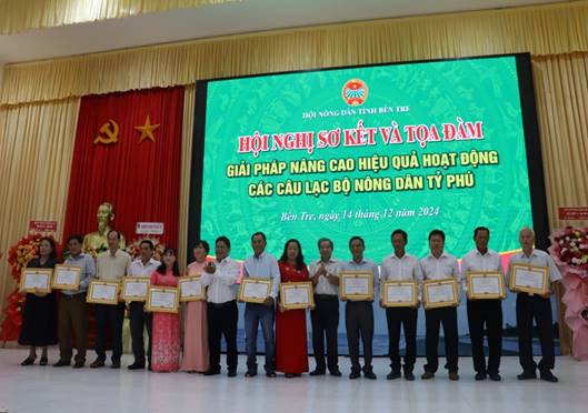 Dịp này, Hội Nông dân tỉnh đã tặng bằng khen cho 04 tập thể và 10 cá nhân có thành tích xuất sắc trong hoạt động CLB Nông dân tỷ phú năm 2024; Nông dân xuất sắc Việt Nam Đặng Văn Bảy- thành viên CLB Nông dân tỷ phú tỉnh hỗ trợ 120 triệu đồng cho hộ nông dân khó khăn xã Thạnh Hải, huyện Thạnh Phú thực hiện mô hình trồng rau màu và tặng 50 triệu đồng xây dựng 01 căn nhà Nghĩa tình nông dân cho Hội Nông dân huyện Thạnh Phú; CLB Nông dân tỷ phú tỉnh hỗ trợ 20 triệu đồng cho Phòng Giáo dục và Đào tạo huyện Thạnh Phú để mua bảo hiểm y tế cho các em học sinh có hoàn cảnh khó khăn.