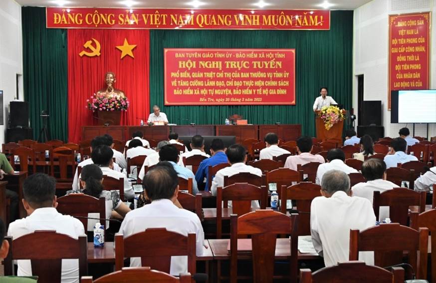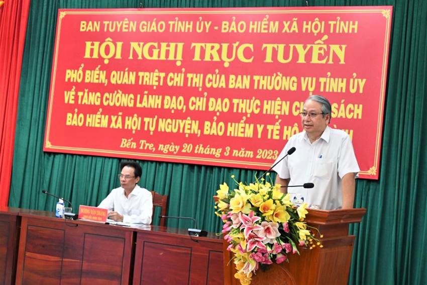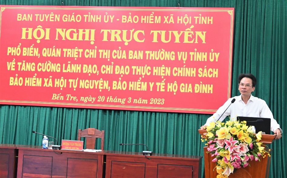 Chiều ngày 20/3/2023, tại hội trường Tỉnh ủy, Ban Tuyên giáo Tỉnh ủy và BHXH tỉnh phối hợp tổ chức hội nghị trực tuyến phổ biến, quán triệt Chỉ thị số 13-CT/TU ngày 23/2/2023 của Ban Thường vụ Tỉnh ủy về tăng cường công tác lãnh đạo, chỉ đạo thực hiện chính sách bảo hiểm xã hội (BHXH) tự nguyện, bảo hiểm y tế (BHYT) hộ gia đình. Ông Cao Văn Dũng, Ủy viên Ban Thường vụ, Trưởng Ban Tuyên giáo Tỉnh ủy; ông Dương Văn Thắng, Giám đốc BHXH tỉnh, Phó Trưởng Ban Chỉ đạo thực hiện chính sách BHXH, BHYT tỉnh chủ trì hội nghị.