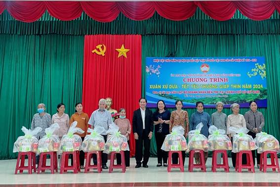 Ngày 05 – 02 – 2024, Ban Thường trực Ủy ban MTTQ Việt Nam tỉnh Bến Tre phối hợp với Câu lạc bộ Doanh nhân Bến Tre tại Thành phố Hồ Chí Minh tổ chức chương trình trao quà Tết Nguyên đán Giáp Thìn 2024 cho hộ gia đình khó khăn trên địa bàn huyện Châu Thành và thành phố Bến Tre.