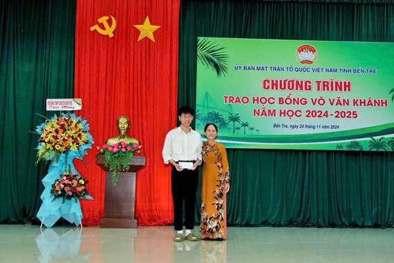 Song song đó, bà Võ Thị Nghĩa – Con gái của Cố Bí thư Tỉnh ủy Võ Văn Khánh, Phó Trưởng Ban điều hành Quỹ học bổng Võ Văn Khánh đã trao phần thưởng với số tiền 05 triệu đồng để động viên, khích lệ tinh thần hiếu học của em Lê Tuấn Kiệt ở huyện Mỏ Cày Bắc (sinh viên xuất sắc 04 năm liền).