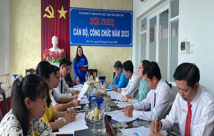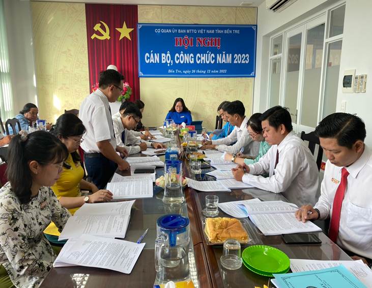 Nhằm phát huy dân chủ trong hoạt động của cơ quan, tạo điều kiện để cán bộ, công chức đề xuất, kiến nghị đến lãnh đạo cơ quan để nâng cao chất lượng, hiệu quả công việc, đồng thời góp ý bổ sung, sửa đổi một số nội dung của các quy chế thực hiện của đơn vị. Căn cứ điều 5, chương II, Nghị định 04/2015/NĐ-CP ngày 09/01/2015 của Chính phủ về việc thực hiện dân chủ trong hoạt động của cơ quan hành chính nhà nước và đơn vị công lập, ngày 26 tháng 12 năm 2022, Thủ trưởng cơ quan phối hợp với Ban chấp hành công đoàn cơ sở cơ quan Ủy ban MTTQ Việt Nam tỉnh tổ chức hội nghị cán bộ công chức, người lao động năm 2023 gắn với tổng kết hoạt động công đoàn năm 2022.