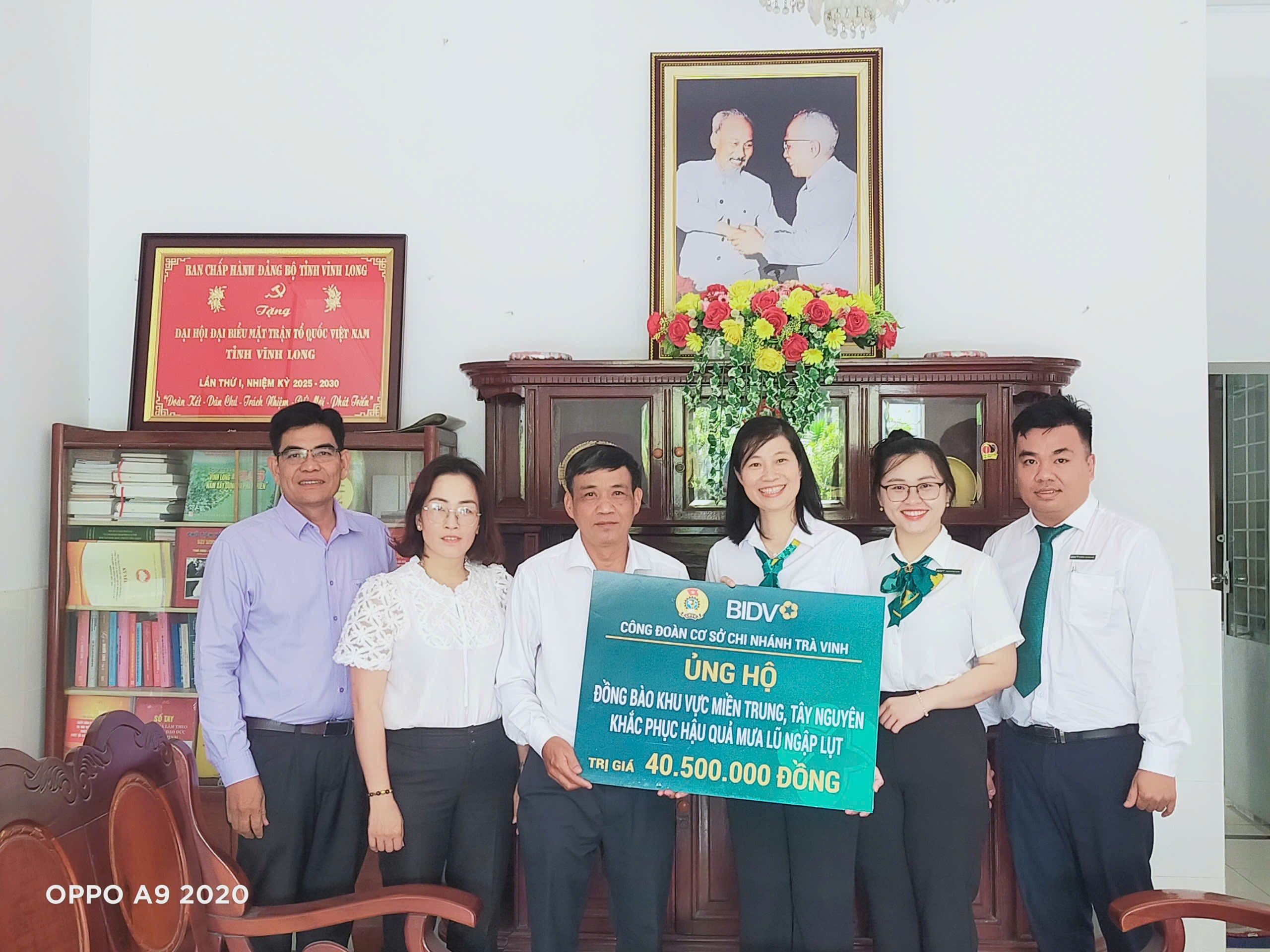 Tại buổi tiếp nhận, đại diện Công đoàn cơ sở BIDV chi nhánh Trà Vinh trao bảng tương trưng kinh phí 40.500.000 đồng để ủng hộ đồng bào khu vực vực miền Trung và Tây Nguyên khắc phục hậu quả mưa lũ, ngập lụt.