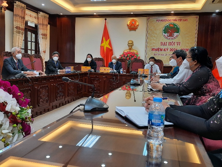 Ngày 13-14/01/2022, Đại hội đại biểu toàn quốc Hội Người cao tuổi (NCT) Việt Nam lần thứ VI, nhiệm kỳ 2021-2026 được tổ chức theo hình thức trực tuyến đã thành công tốt đẹp. Tham dự Đại hội tại điểm cầu Hà Nội có ông Trần Thanh Mẫn, Ủy viên Bộ Chính trị, Phó Chủ tịch Thường trực Quốc hội; bà Võ Thị Ánh Xuân, Phó Chủ tịch nước; đại diện lãnh đạo các bộ, ban, ngành, đoàn thể Trung ương cùng 333 đại biểu đại diện cho trên 9,7 triệu hội viên NCT trên cả nước. Tại điểm cầu Bến Tre, tham dự có bà Nguyễn Thị Bé Mười, Tỉnh ủy viên, Phó Chủ tịch Ủy ban nhân dân tỉnh; ông Huỳnh Khắc Hiệp, nguyên Trưởng Ban đại diện Hội NCT tỉnh, ông Nguyễn Châu Sơn, Trưởng Ban đại diện Hội NCT tỉnh; đại diện lãnh đạo Ủy ban MTTQ Việt Nam tỉnh, Sở Lao động Thương binh và Xã hội, Sở Nội vụ, Ban Dân vận Tỉnh ủy; Trưởng Ban đại diện Hội NCT các huyện, thành phố.