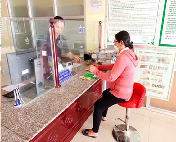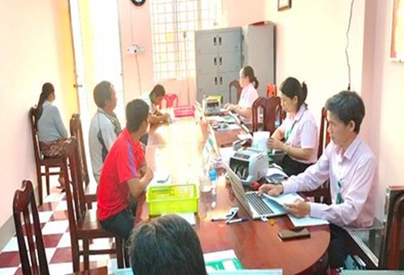 Đại diện hộ gia đình người CHXAPT đến nhận tiền vay tại Phòng giao dịch NHCSXH huyện Mỏ Cày Bắc