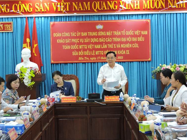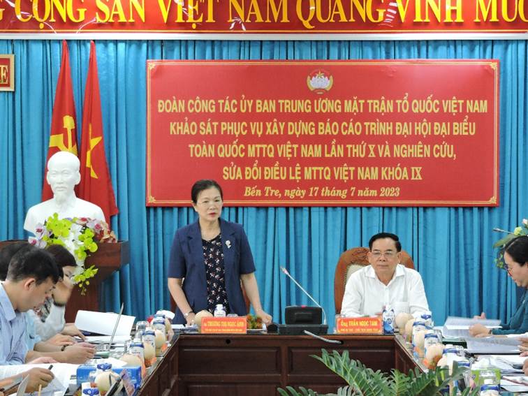 Ngày 17-7-2023, đoàn khảo sát của Ủy ban Trung ương MTTQ Việt Nam do đồng chí Trương Thị Ngọc Ánh-Phó Chủ tịch Ủy ban Trung ương MTTQ Việt Nam làm trưởng đoàn có chuyến làm việc với Ban Thường trực Ủy ban MTTQ Việt Nam tỉnh Bến Tre về phục vụ xây dựng báo cáo trình Đại hội đại biểu toàn quốc MTTQ Việt Nam lần thứ X và nghiên cứu, sửa đổi Điều lệ MTTQ Việt Nam khóa IX.