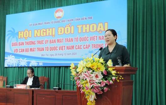 Phát biểu kết luận tại hội nghị đối thoại, Chủ tịch Ủy ban MTTQ Việt Nam tỉnh Nguyễn Thị Hồng Nhung ghi nhận, đánh giá cao những kết quả mà MTTQ các cấp đã làm để có những điểm nhấn về cao điểm thi đua “Đồng khởi mới”, công tác xây dựng nông thôn mới, đô thị văn minh, đặc biệt là những nhiệm vụ về xóa nhà tạm, nhà dột nát. Có được kết quả này là nhờ vào sự lãnh, chỉ đạo quyết liệt, đồng bộ của cấp ủy, chính quyền các cấp, cũng như công tác tuyên truyền vận động của cán bộ MTTQ các cấp và các tổ chức chính trị - xã hội. Về giải pháp trong thời gian tới, nhất là thực hiện cao điểm thi đua “Đồng khởi mới” trong năm 2025, Chủ tịch Ủy ban MTTQ Việt Nam tỉnh đề nghị MTTQ các cấp dồn sức thực hiện đạt 3 nội dung chính: Tập trung tham gia tổ chức tốt Đại hội đảng các cấp nhiệm kỳ 2025 - 2030; huy động, phát huy tinh thần, trách nhiệm của người dân tham gia tích cực vào đại hội như tham gia góp ý văn kiện, giám sát trách nhiệm của đảng viên… vận động người dân hưởng ứng các phong trào thi đua chào mừng Đại hội đảng các cấp, các ngày lễ lớn trong năm 2025. Tham gia tuyên truyền, vận động tạo sự đồng thuận của cán bộ, đảng viên và giám sát trong sắp xếp tinh gọn tổ chức bộ máy đảm bảo hoạt động hiệu năng, hiệu lực, hiệu quả. Tập trung nỗ lực hoàn thành các chỉ tiêu nghị quyết cấp ủy các cấp năm 2025, đặc biệt là các chỉ tiêu nhiệm kỳ năm 2020 - 2025./.