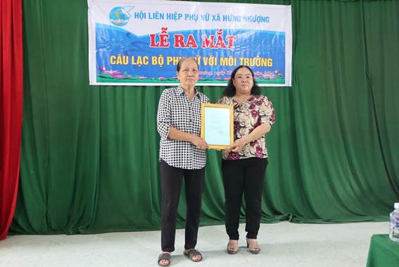 Dịp này, Hội LHPN xã Hưng Nhượng trao Quyết định công nhận 03 hội viên danh dự thuộc Hội LHPN xã Hưng Nhượng; bà Lê Thị Hồ Thu tặng cho Câu lạc bộ Phụ nữ với môi trường ấp Bàu Dơi 21 chiếc áo đồng phục.