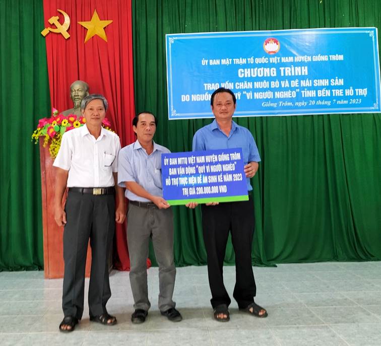 Vốn sinh kế hỗ trợ cho đối tượng là hộ nghèo, hộ cận nghèo có ý chí vươn lên trong cuộc sống, mong muốn thoát nghèo và phải có đất sản xuất, trồng cỏ, có công lao động, cần cù, siêng năng, chịu học hỏi, thực hiện tốt các yêu cầu khi được hỗ trợ vốn. Hình thức hỗ trợ là cho mượn vốn mua con giống không tính lãi và thời gian thu hồi vốn là 03 năm kể từ ngày hộ gia đình nhận được vốn. Theo đó, những hộ nhận vốn chăn nuôi dê sinh sản được hỗ trợ 10 triệu đồng/hộ; chăn nuôi bò sinh sản được hỗ trợ 20 triệu đồng/hộ. Tổng kinh phí hỗ trợ là 200 triệu đồng, nguồn vốn do Quỹ “Vì người nghèo” tỉnh Bến Tre phân bổ để hỗ trợ phát triển sinh kế cho các hộ nghèo, hộ cận nghèo, hộ có hoàn cảnh đặc biệt khó khăn năm 2023.