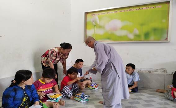 Sư cô Thích nữ Diệu Hồng tặng quà cho trẻ em nhiễm chất độc da cam tại nhà nuôi dưỡng