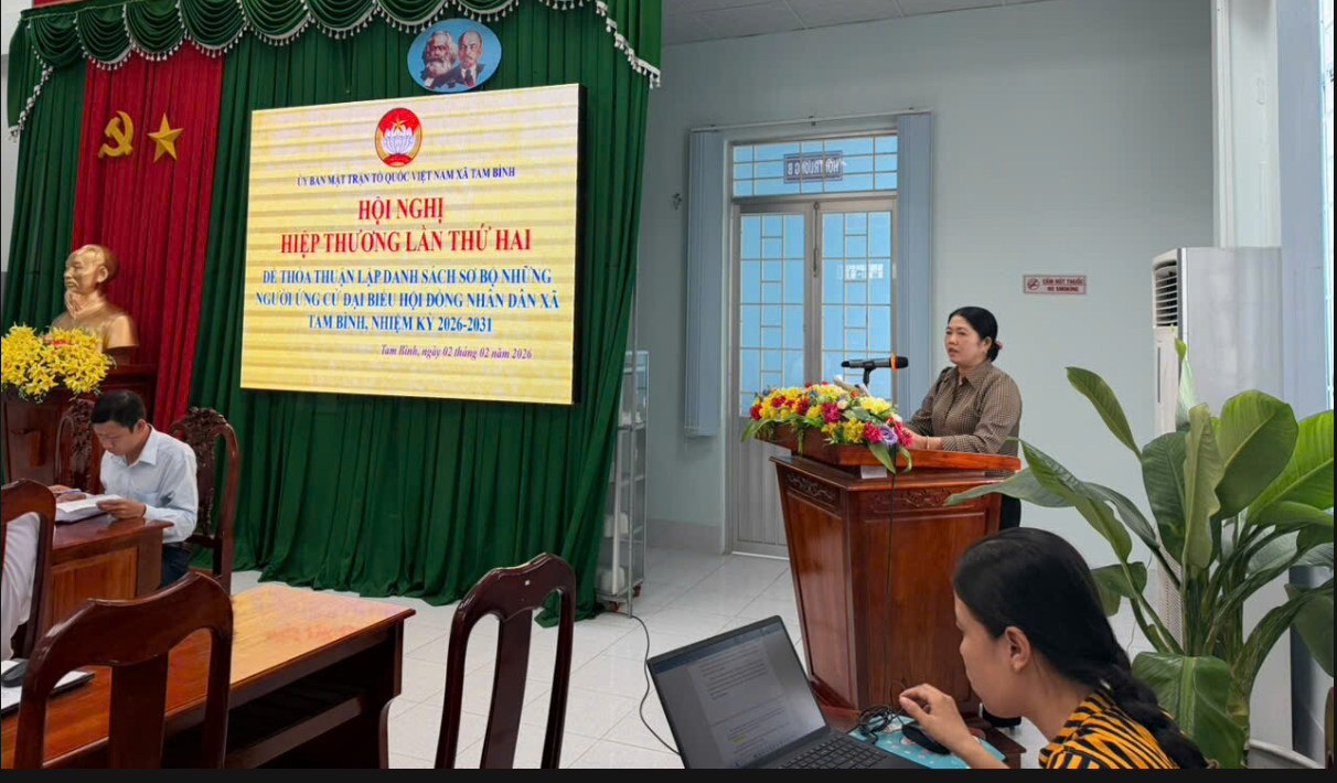 Ngày 02/02, tại Hội trường Đảng ủy xã, Ủy ban Mặt trận Tổ quốc Việt Nam xã Tam Bình đã tổ chức Hội nghị hiệp thương lần thứ hai để thỏa thuận lập danh sách sơ bộ những người ứng cử đại biểu Hội đồng nhân dân xã Tam Bình, nhiệm kỳ 2026 - 2031.