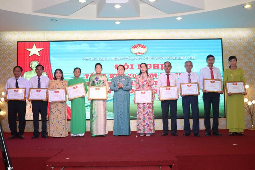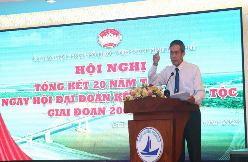Chiều ngày 20/6/2023, Ban Thường trực Ủy ban MTTQ Việt Nam tỉnh Bến Tre tổ chức Hội nghị tổng kết 20 năm Ngày hội “Đại đoàn kết toàn dân tộc” tỉnh Bến Tre giai đoạn 2003-2023. Tham dự có ông Võ Văn Thiện, Trưởng ban Công tác phía Nam Ủy ban Trung ương MTTQ Việt Nam, bà Hồ Thị Hoàng Yến, Phó Bí thư Thường trực Tỉnh ủy; bà Nguyễn Thị Hồng Nhung, Chủ tịch Ủy ban MTTQ Việt Nam tỉnh, bà Nguyễn Thị Bé Mười, Phó Chủ tịch UBND tỉnh, đại diện lãnh đạo các ban đảng, HĐND, các sở, ngành tỉnh, các tổ chức thành viên của Mặt trận tỉnh, các đồng chí nguyên lãnh đạo Ủy ban MTTQ Việt Nam tỉnh qua các nhiệm kỳ, các tập thể, cá nhân tiêu biểu được tuyên dương, khen thưởng.