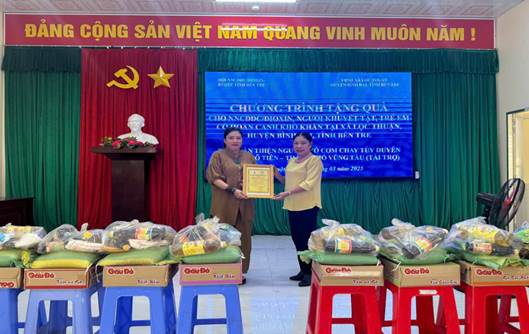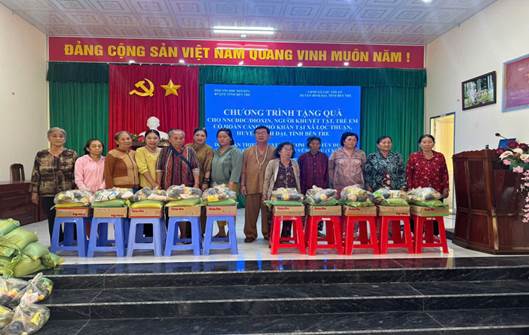 * Được sự tài trợ của Đoàn Thiện nguyện Tổ cơm chay Tuỳ Duyên, Yaourt Cô Tiên ở thành phố Vũng Tàu, ngày 23/3/2025 Hội NNCĐDC/dioxin- BVQTE tỉnh Bến Tre phối hợp với UBND xã Lộc Thuận, huyện Bình Đại tổ chức tặng 100 suất quà cho nạn nhân chất độc da cam, người khuyết tật, trẻ em có hoàn cảnh khó khăn, mỗi suất quà trị giá 350 ngàn đồng gồm: gạo, mì tô và một số nhu yếu phẩm, với tổng số tiền 35 triệu đồng do bà Đào Thị Hoa Tiên, Yaourt Cô Tiên ở thành phố Vũng Tàu tài trợ.