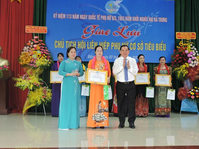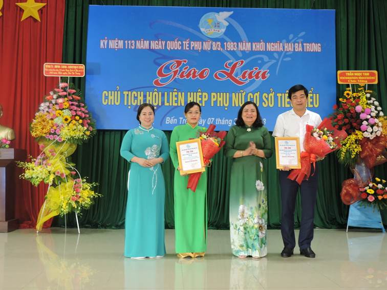Dịp này, Ngân hàng Đầu tư và Phát triển Việt Nam Chi nhánh Bến Tre tặng 200 bồn chưa nước hỗ trợ khắc phục hạn mặn trị giá 300 triệu đồng cho nữ công nhân khó khăn trên địa bàn huyện Châu Thành. Ban Thường vụ Hội LHPN tỉnh tặng hoa, quà cùng những lời chúc mừng tốt đẹp nhất đến nguyên lãnh đạo Hội LHPN qua các thời kỳ, các đồng chí cán bộ nữ lãnh đạo, quản lý trên các lĩnh vực góp phần cho sự phát triển chung của tỉnh nhà.