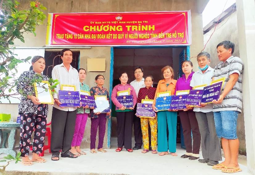 Nhằm tạo điều kiện cho hộ nghèo khó khăn về nhà ở có một mái ấm khang trang, từ đó an tâm tham gia lao động, sản xuất phát triển kinh tế, vươn lên thoát nghèo bền vững, góp phần cùng địa phương thực hiện tốt công tác giảm nghèo. Quỹ “Vì người nghèo” tỉnh Bến Tre đã hỗ trợ kinh phí 500.000.000 đồng để xây dựng 10 căn nhà đại đoàn kết cho hộ nghèo khó khăn về nhà ở trên địa bàn huyện Ba Tri.